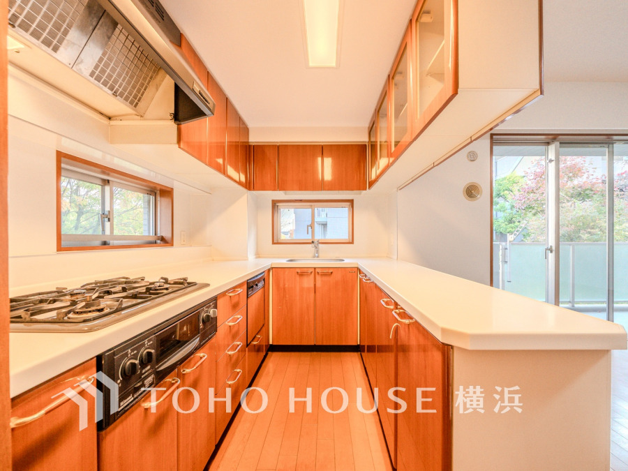 明るい木目調の充実収納と広いカウンターで使いやすい、機能的で大きなコの字型キッチンです。