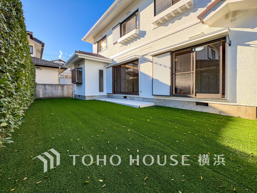 陽当たり良好な庭付き一戸建て。手入れの行き届いた人工芝で快適なアウトドアスペースを実現しています。