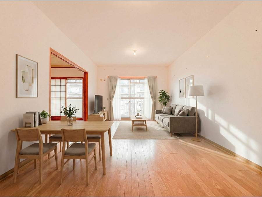 時間のゆとりと空間、爽やかな陽光がもたらす光と風を贅沢なまでに感じる暮らしが始まります。 (家具・装飾品はAI加工です)