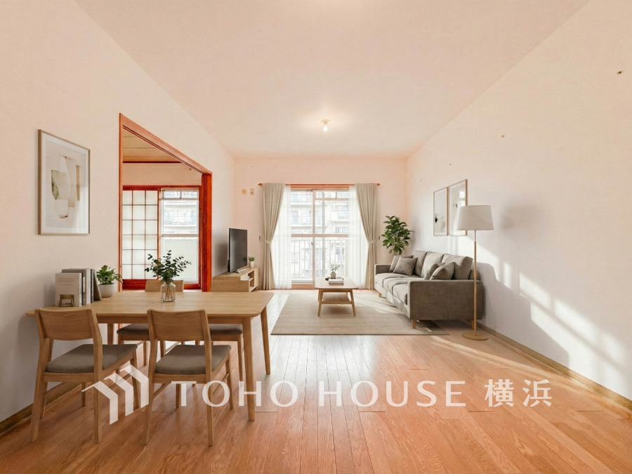 大きな窓から明るい光が差し込むリビング。和室が隣接した居心地の良い住空間です。