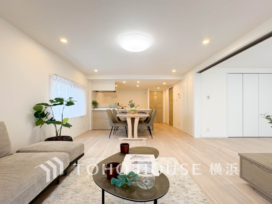 明るく開放的な空間が広がるLDK。室内には豊かな陽光が注ぎ込み、爽やかな住空間を演出。ホームパーティーでもゲストと一緒に料理を楽しみながら楽しい時間を過ごせそう。