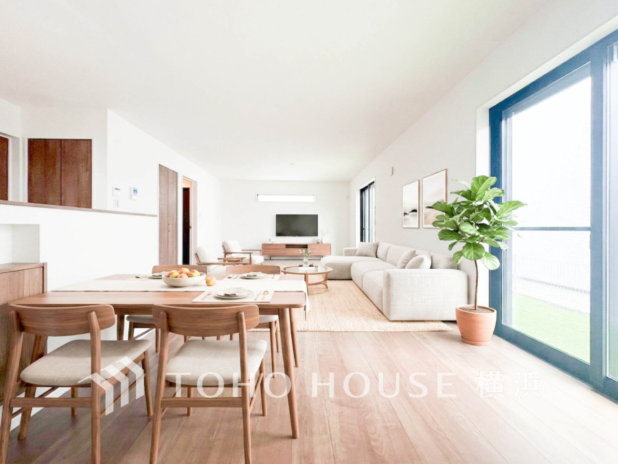 広々としたリビングは大きな窓から自然光がたっぷり入り、明るく開放的な空間を実現しています。