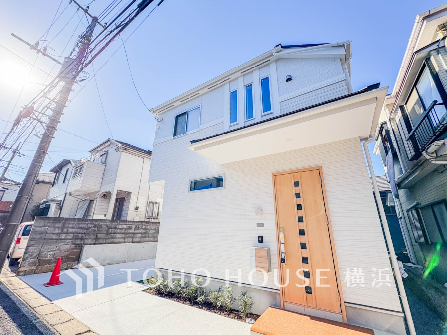 陽光あふれる白壁のモダンな新築戸建。駐車スペース付きで快適な住環境を実現しています。
