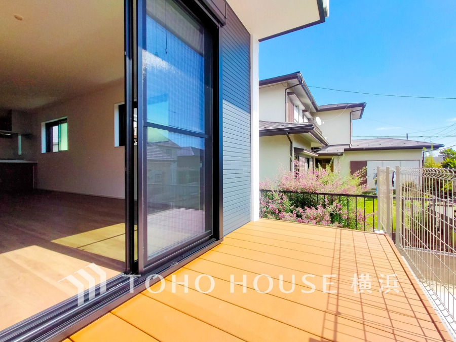 陽当りの良いゆったりウッドデッキ。アウトリビングとしてもお楽しみ頂けます。休日にはテーブルを出してティータイムを楽しんでみたりも素敵ですね。