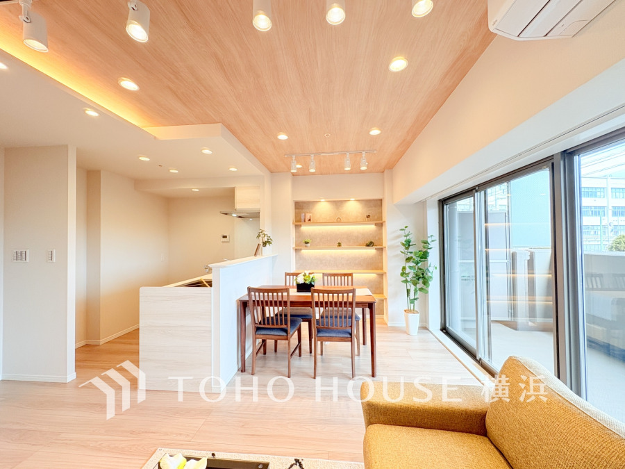 温かみのある木目天井と照明が映える、開放的で明るいリビングダイニング空間です。
