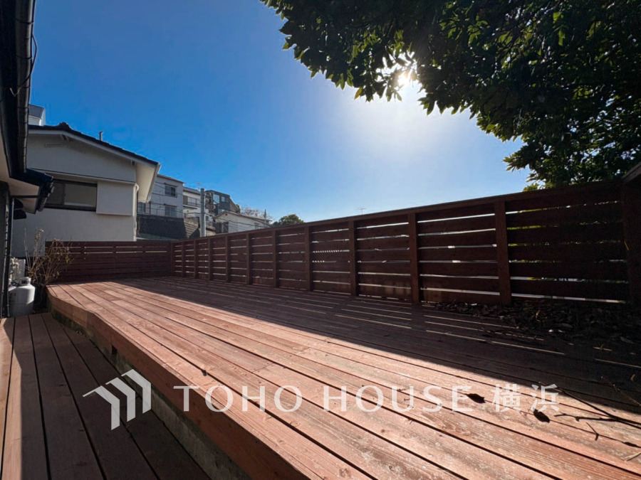 陽当りの良いゆったりウッドデッキ。アウトリビングとしてもお楽しみ頂けます。休日にはテーブルを出してティータイムを楽しんでみたりも素敵ですね。