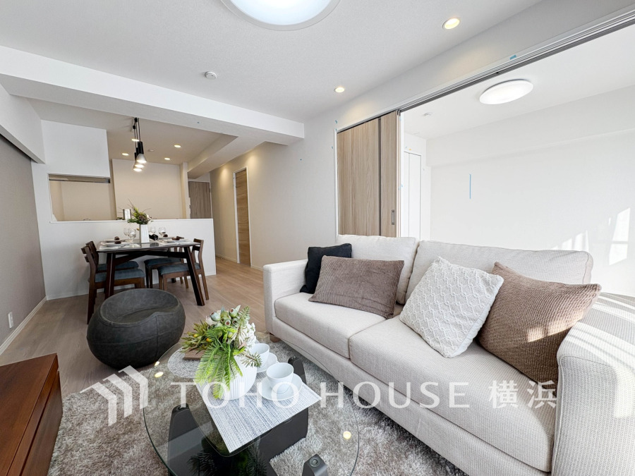 明るく開放的な空間が広がるLDK。室内には豊かな陽光が注ぎ込み、爽やかな住空間を演出。ホームパーティーでもゲストと一緒に料理を楽しみながら楽しい時間を過ごせそう。