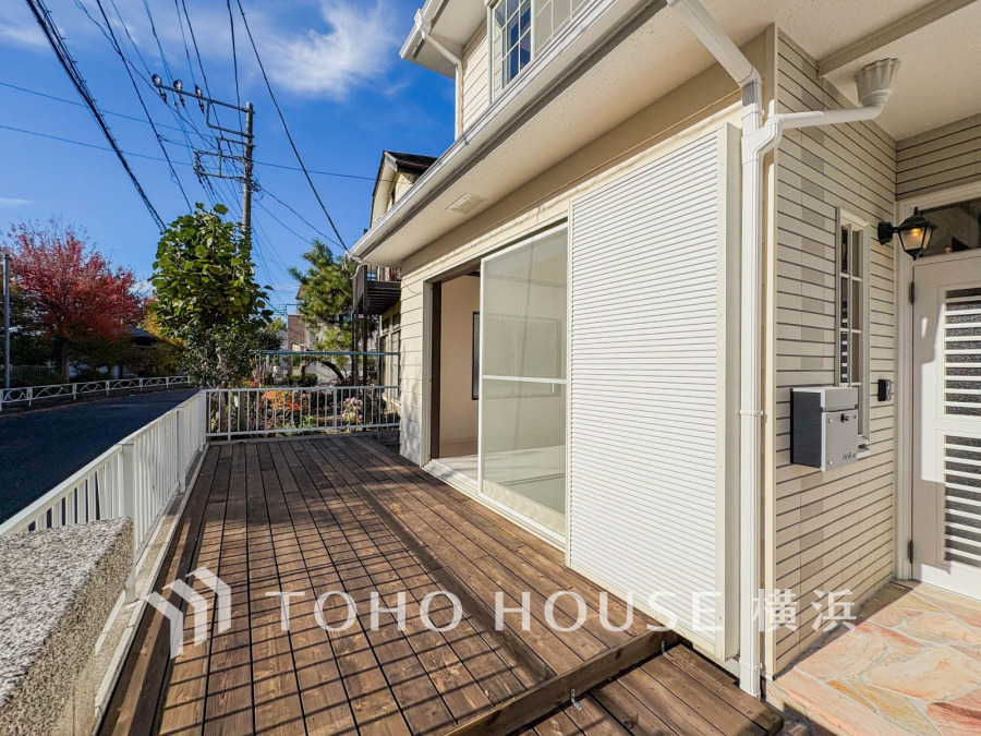 リビングとつながり開放的な空間が広がるウッドデッキ。テーブルセットを置いて天気の良い日にはのんびり過ごすのもいいですね。