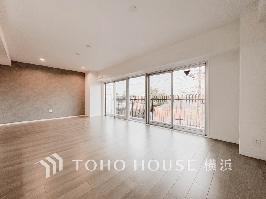大きな窓から自然光が差し込む、開放感あふれるリビングルーム。落ち着いたアクセントウォールが魅力です。