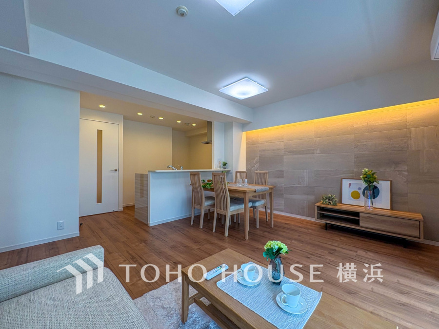 明るく開放的な空間が広がるLDK。室内には豊かな陽光が注ぎ込み、爽やかな住空間を演出。ホームパーティーでもゲストと一緒に料理を楽しみながら楽しい時間を過ごせそう。