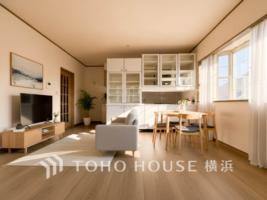 家族と過ごすひと時を溢れる光が優しく包み込むリビングダイニング。家族とともに、心穏やかに過ごすひととき。家族との時間、自分の時間を大切にできる空間がここにあります。(家具はAI加工です)
