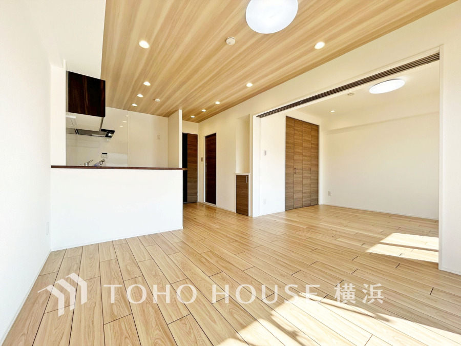 ナチュラルカラーで統一された明るいリビング。キッチンと続く開放感のある間取りで、家族が集う快適空間です。