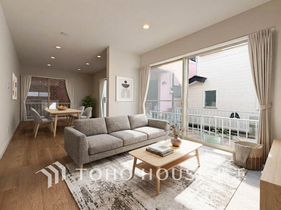明るく開放的な空間が広がるLDK。室内には豊かな陽光が注ぎ込み、爽やかな住空間を演出。ホームパーティーでもゲストと一緒に料理を楽しみながら楽しい時間を過ごせそう。