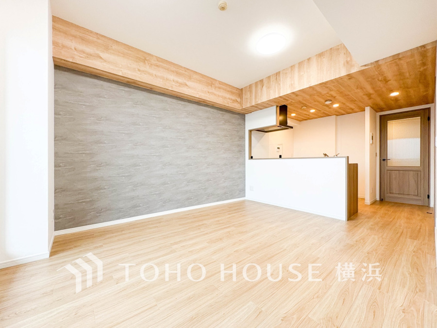 木目調の天井とアクセントクロスが映える、明るく開放的なLDK空間です。