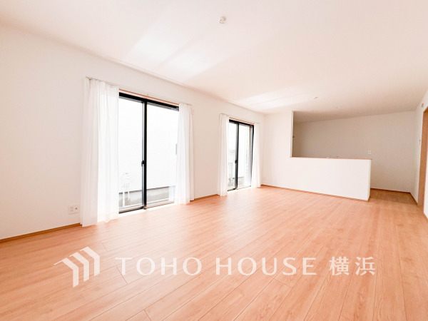 集いのLDKは広々19.1帖!開放的な勾配天井の空間。暖かな陽射しがたっぷりと舞い込み、心地よい寛ぎの時をいざないます。