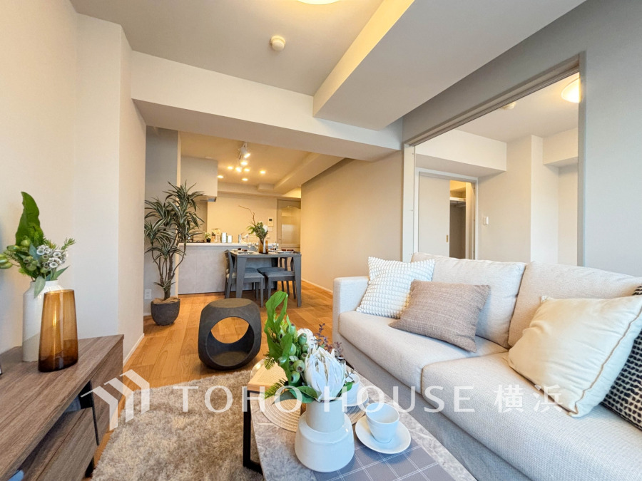 明るく開放的な空間が広がるLDK。室内には豊かな陽光が注ぎ込み、爽やかな住空間を演出。ホームパーティーでもゲストと一緒に料理を楽しみながら楽しい時間を過ごせそう。