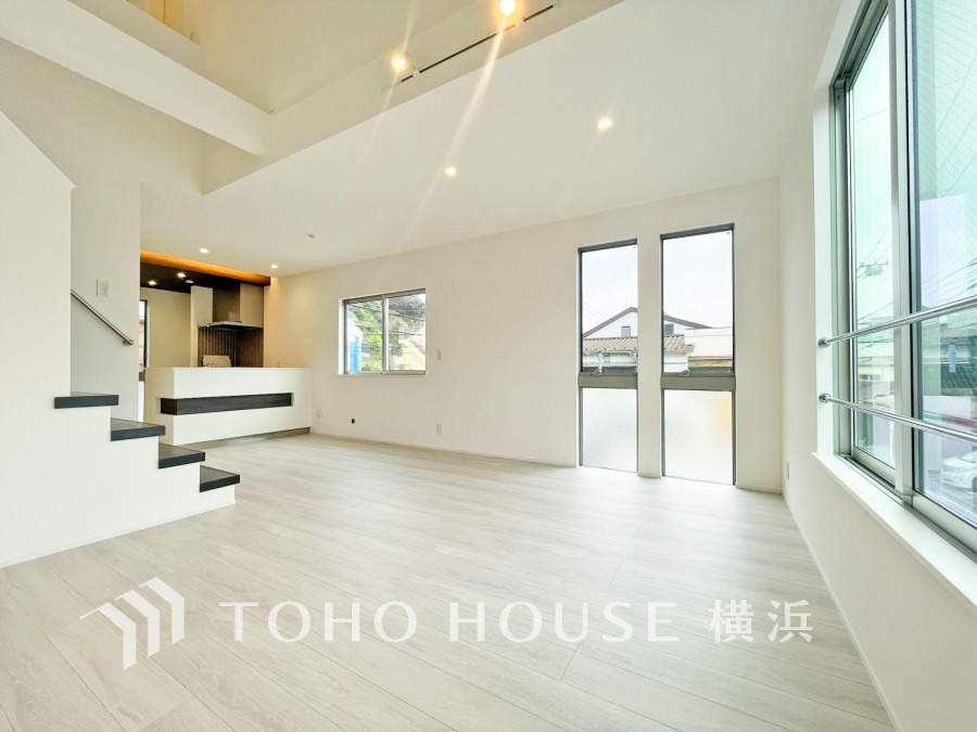 たっぷりと光が広がるLDKは、18.75帖のゆとりの空間!お洒落なインテリアのように空間を彩るスケルトン階段が印象的!