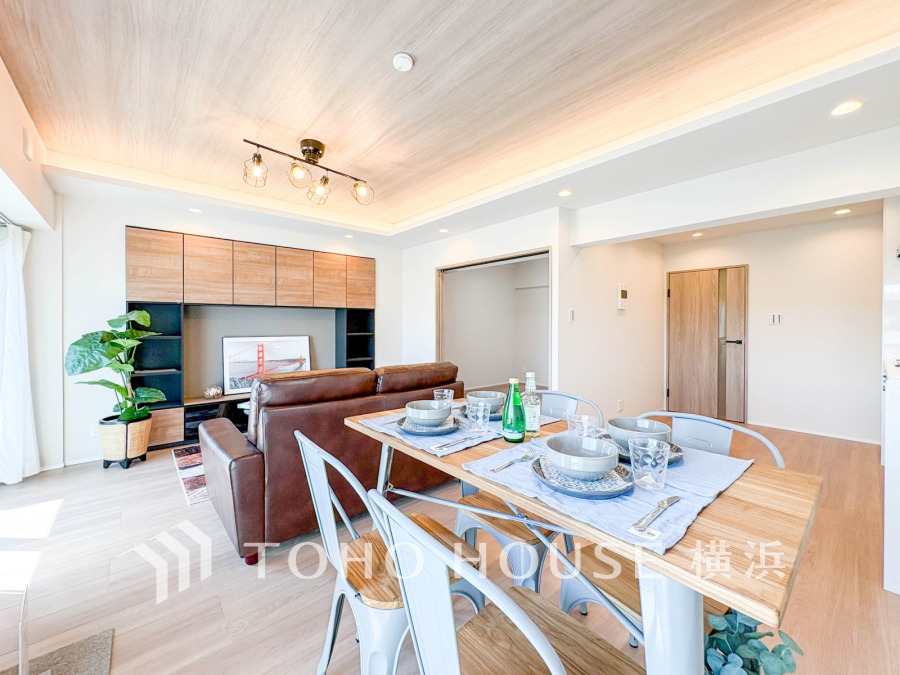 明るく開放的な空間が広がるLDK。室内には豊かな陽光が注ぎ込み、爽やかな住空間を演出。ホームパーティーでもゲストと一緒に料理を楽しみながら楽しい時間を過ごせそう。