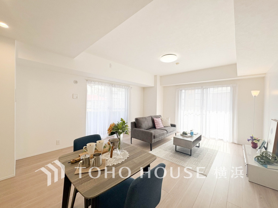 明るく開放的な空間が広がるLDK。室内には豊かな陽光が注ぎ込み、爽やかな住空間を演出。ホームパーティーでもゲストと一緒に料理を楽しみながら楽しい時間を過ごせそう。