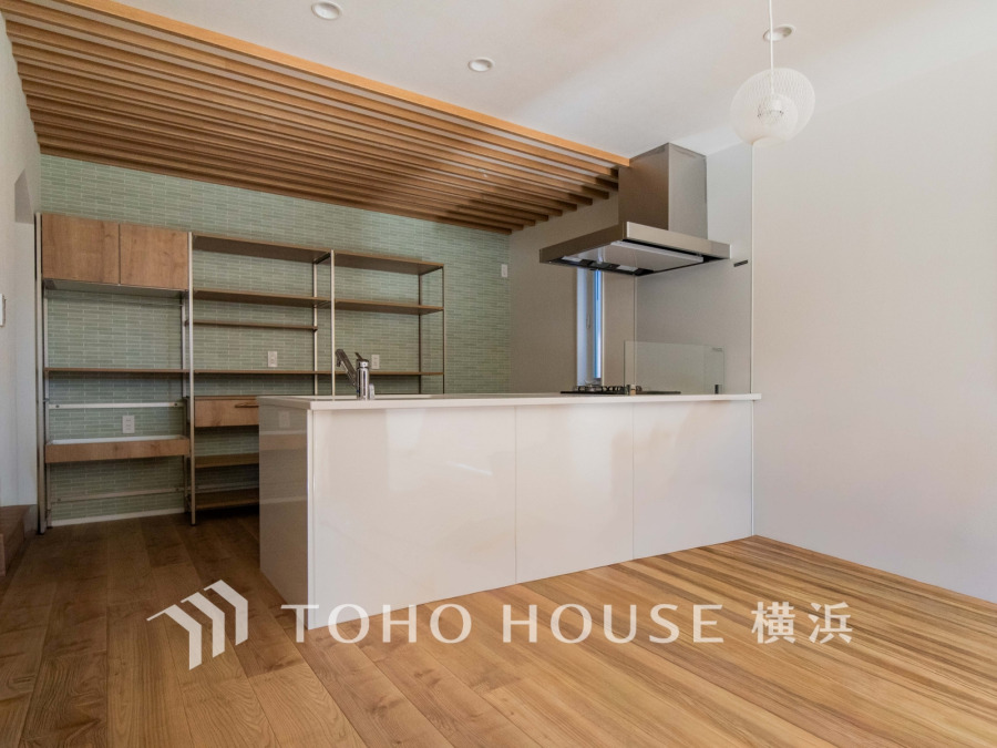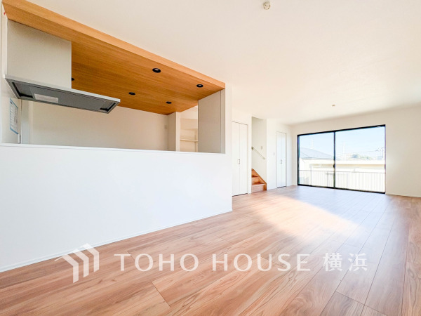 • 木の温もりを感じる広々としたリビングキッチン。シンプルで落ち着いた空間が家族の団らんを演出します。