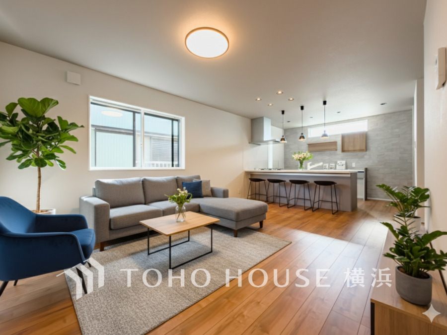 ウッディな色合いのフローリングと清潔感の溢れるクロスが明るい空間を創り出しているリビングダイニングここで楽しむ家族の時間が絆をより深めてくれそうです。(家具はAI加工)