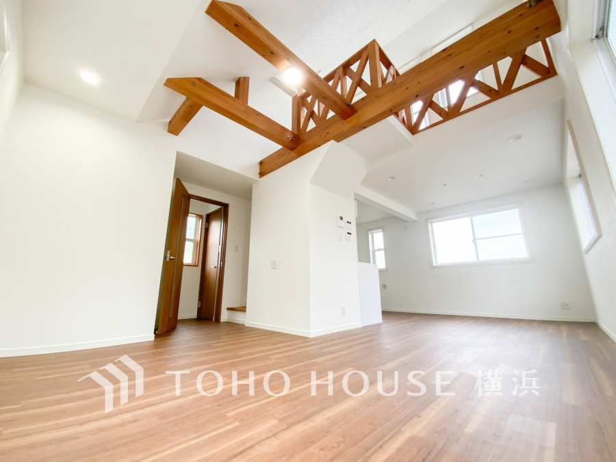 木の梁がアクセントの開放感あふれるリビング。明るい窓とナチュラルな床材が心地よい空間を演出します。