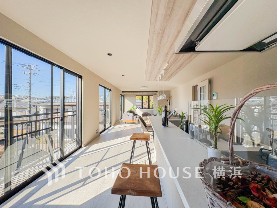 陽光が降り注ぐ広々リビング。開放感ある対面キッチンで家族の会話が弾む快適空間です。