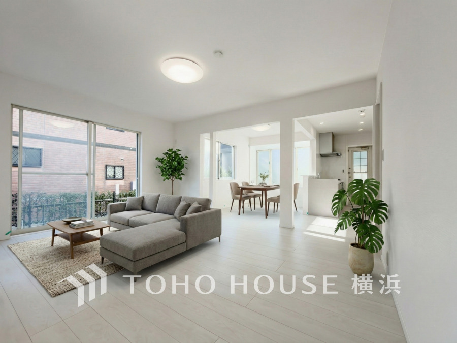 明るく開放的な空間が広がるLDK。室内には豊かな陽光が注ぎ込み、爽やかな住空間を演出。 (家具・装飾品はAI加工です)