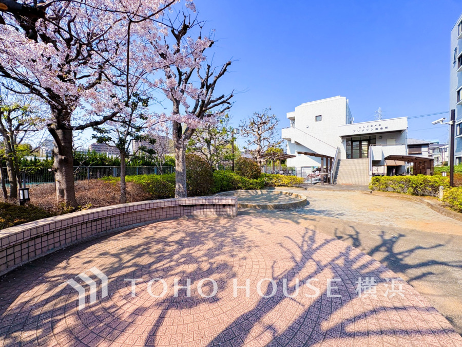 桜が彩る広々とした公園。穏やかな陽光が差し込み、住環境の快適さを実感できる癒しの空間です。