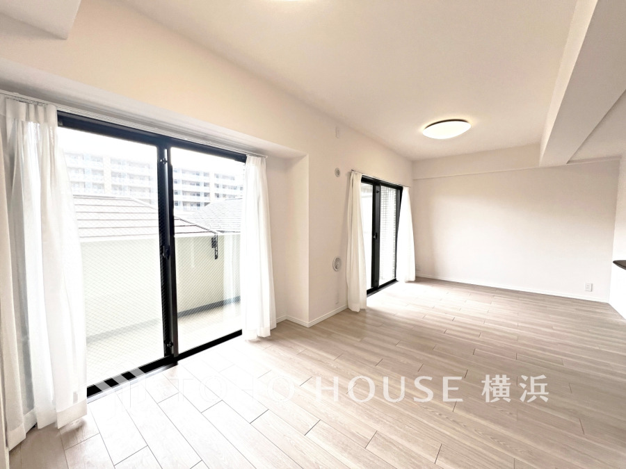 明るい光が差し込むリビング。バルコニーに面し開放感あふれる空間です。
